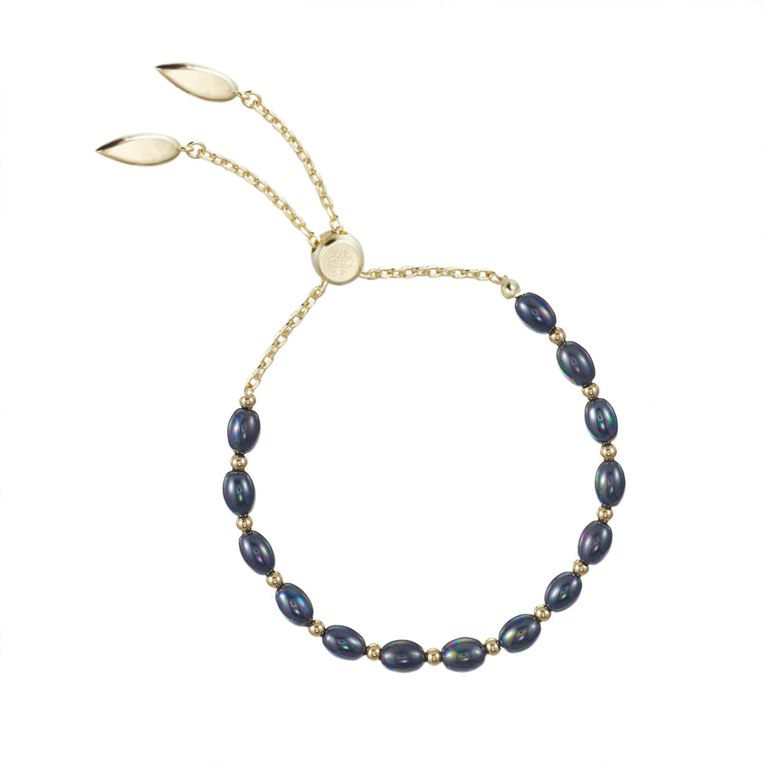 Radiating modern elegance, this bracelet features luminous black pearl beads accented by petite polished gold beads for a sophisticated contrast. The adjustable slider clasp, finished with signature gold teardrop ends, ensures a comfortable, custom fit while adding a touch of refinement. Effortlessly chic and versatile, this piece transitions seamlessly from everyday wear to evening elegance - perfect for stacking or wearing solo.