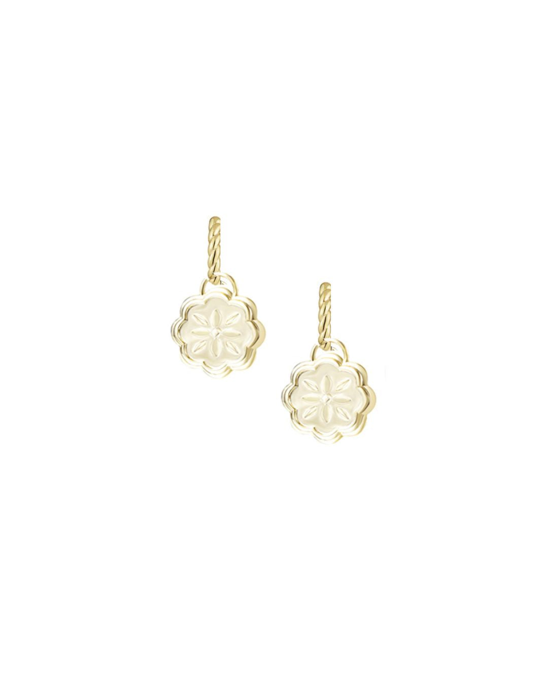 Chic and timeless, these floral medallion earrings add a touch of feminine sophistication to every look. Designed with delicate floral detailing and a scalloped edge, each earring dangles gracefully from a twisted gold-plated hoop for a refined finish. Their soft, sculptural design captures the light beautifully - perfect for both everyday wear and elegant occasions.
