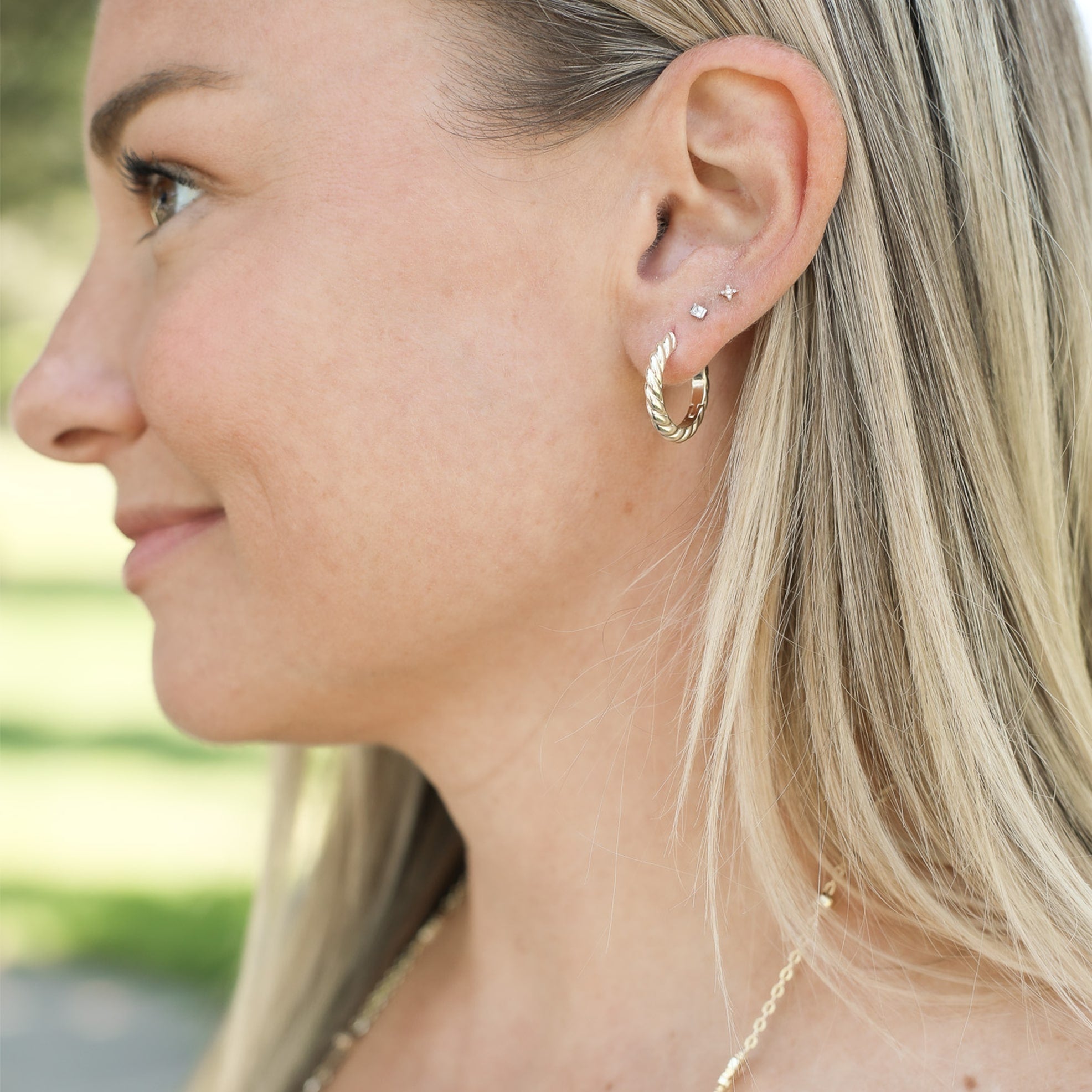Effortlessly chic with a touch of texture, these huggie earrings are a timeless essential for every jewelry collection. Designed in polished 14K gold plating, these small hoops feature a classic twisted rope pattern that adds dimension and shine while remaining lightweight and comfortable for all-day wear. Their petite 0.5" size makes them perfect for everyday styling - whether layered for an earring stack or worn solo for understated elegance.