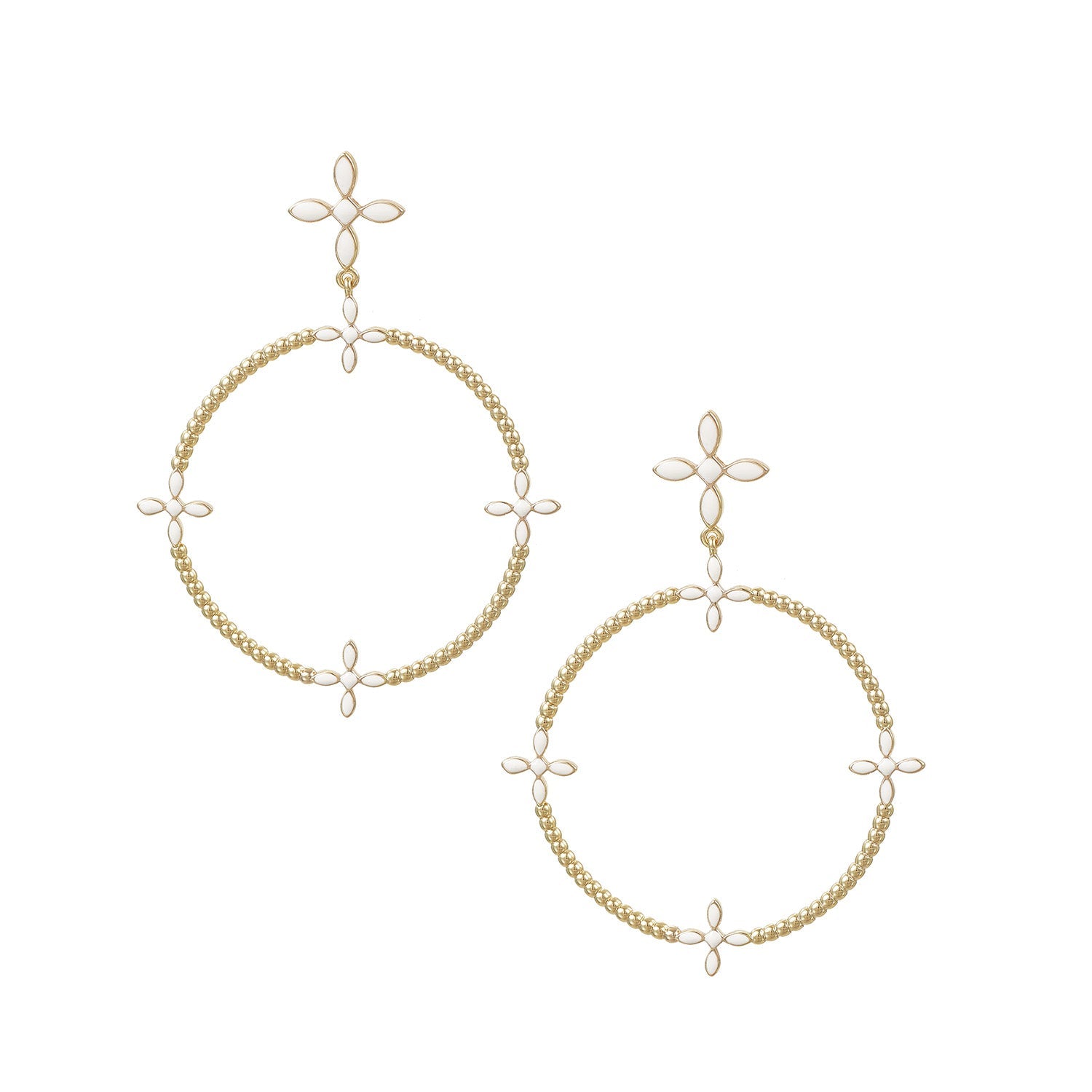 Striking yet sophisticated, these statement hoop earrings feature a radiant gold beaded circle adorned with delicate enamel cross accents - a signature Natalie Wood Designs touch. The intricate detailing and contrast create a modern, elevated look that effortlessly transitions from day to night. Lightweight and eye-catching, they add a bold yet timeless elegance to any outfit.