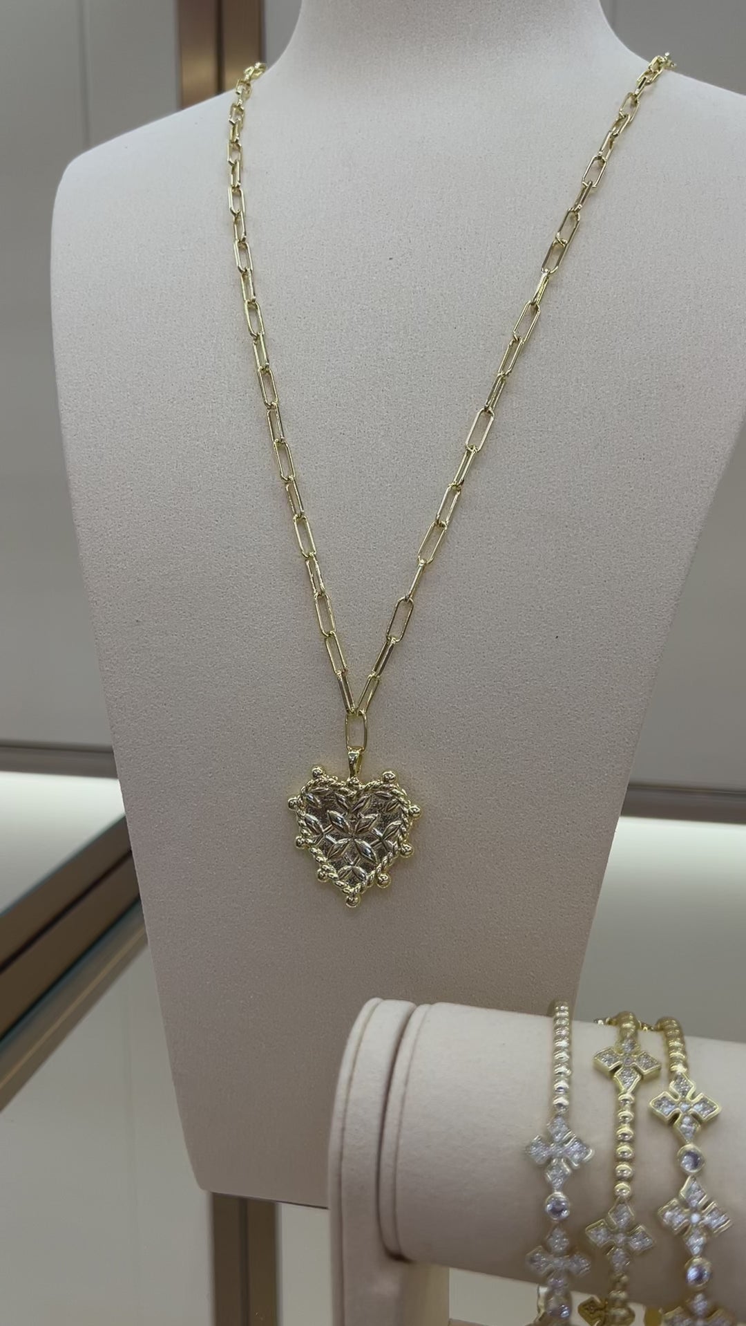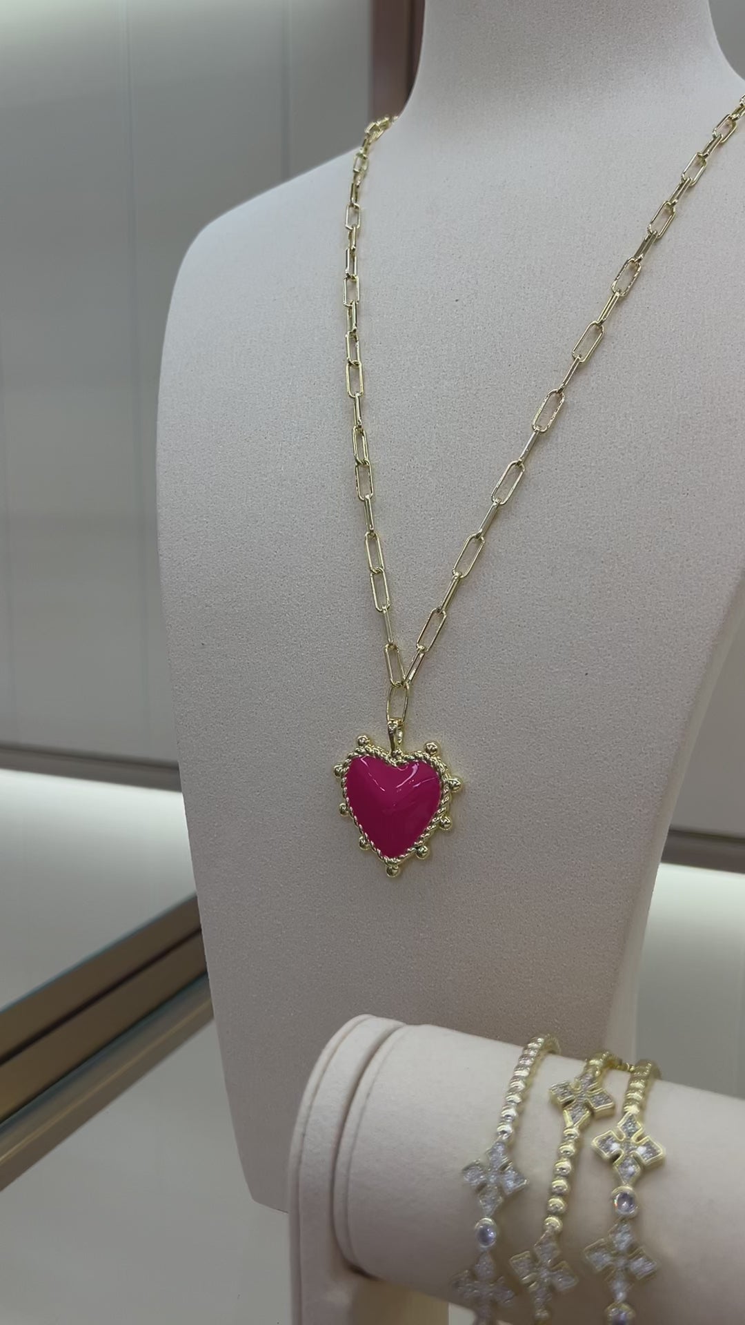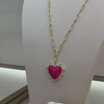 A statement of joy and confidence, this bold pink heart pendant glows with color and meaning. Set in 14k gold-plated metal on a modern paperclip chain, it’s a playful yet timeless piece that adds warmth and happiness to every look, plus it's reversible. Hypoallergenic and designed for effortless, everyday wear.
