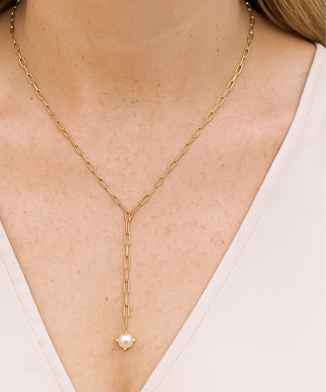 Shine Bright Pearl Lariat Necklace Ivory Pearl Gold