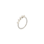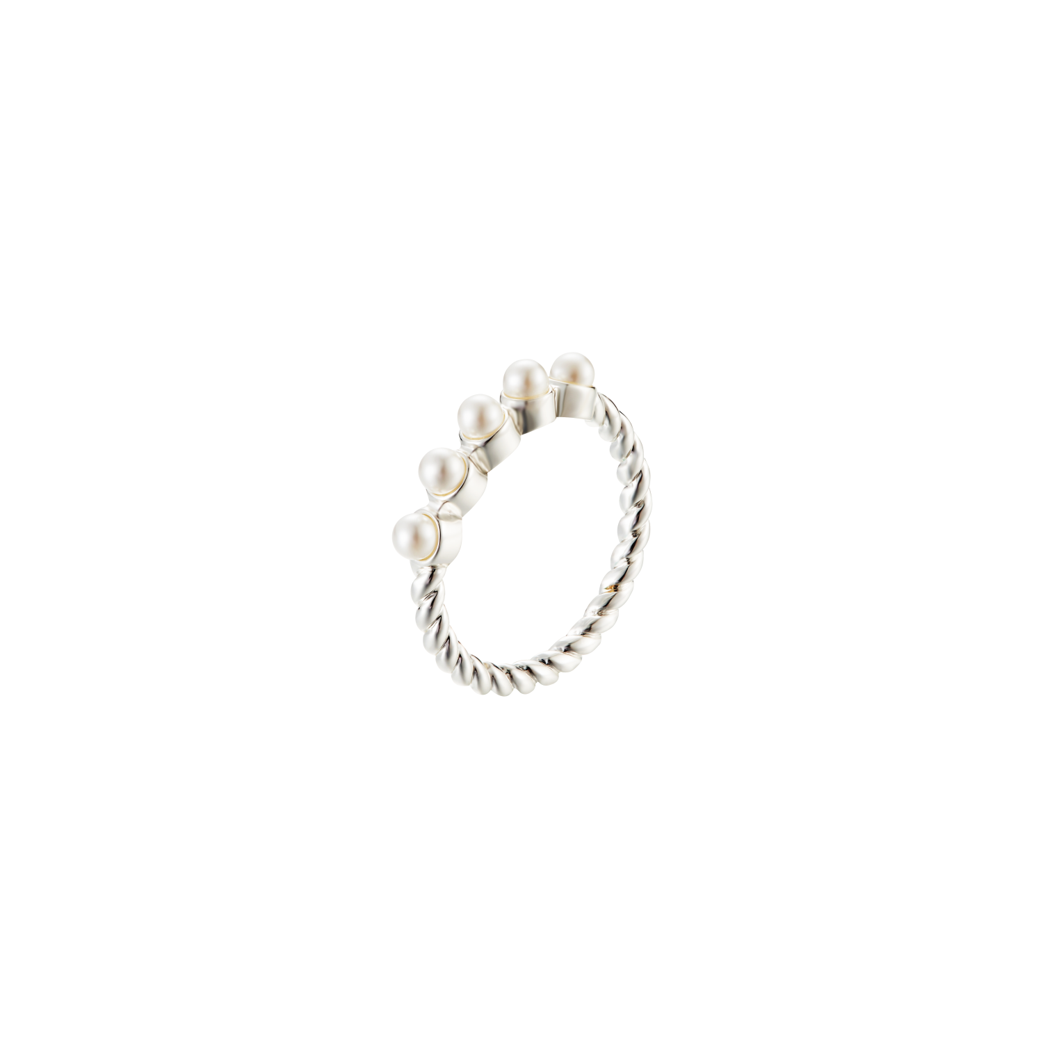 A modern take on a timeless combination. This twisted band stacking ring features a delicate rope band and five luminous pearls, offering texture and dimension in one effortless design. Crafted in silver-plated metal and made to pair seamlessly with your everyday stack.