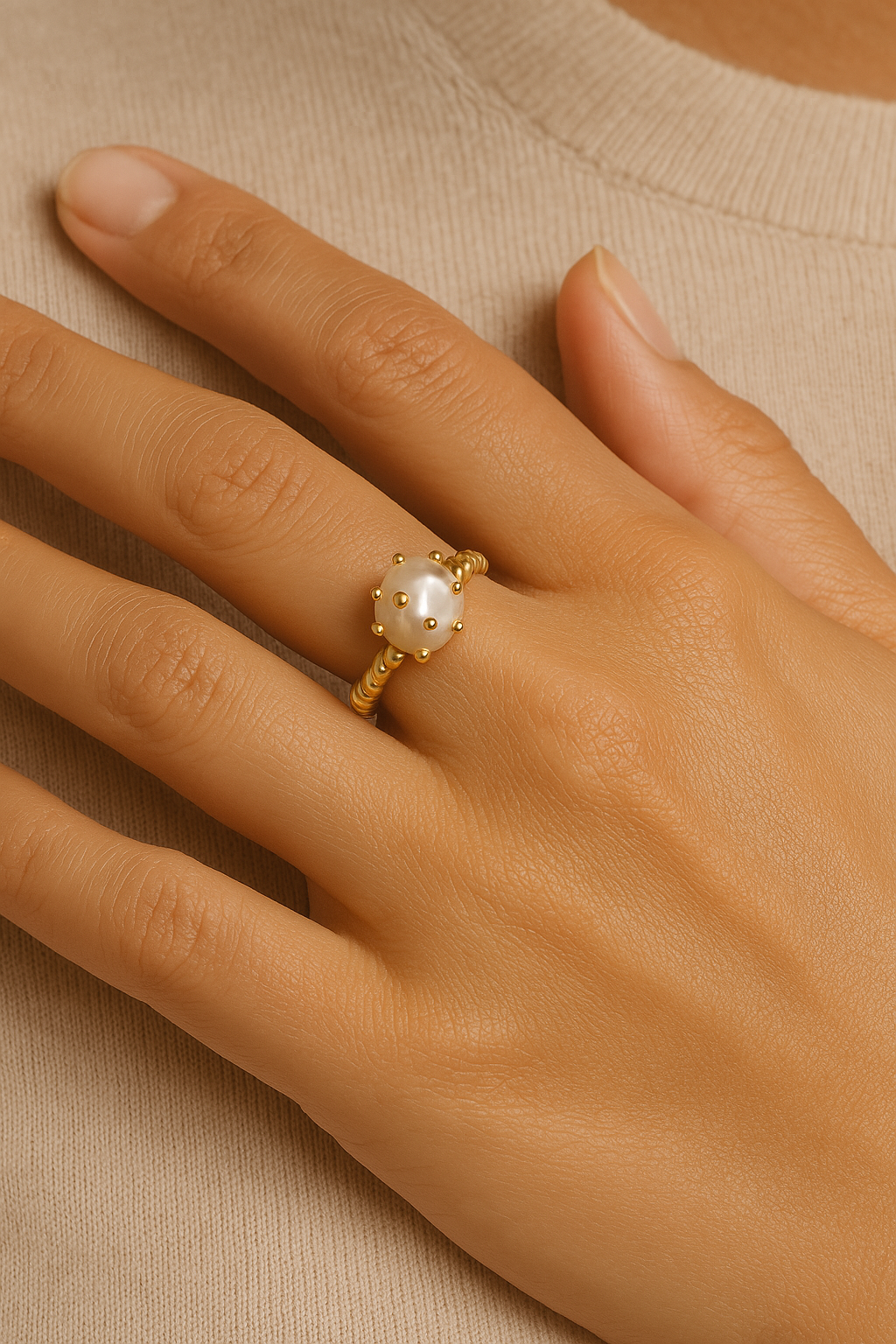 Polished, feminine, and effortlessly chic — the Carolina Ring is that finishing touch that elevates everything you wear. The luminous pearl center brings soft radiance to your hand, while the textured gold band adds a modern twist to a timeless style. Lightweight and comfortable, it’s the kind of piece you’ll slip on every day without thinking twice — and never want to take off.