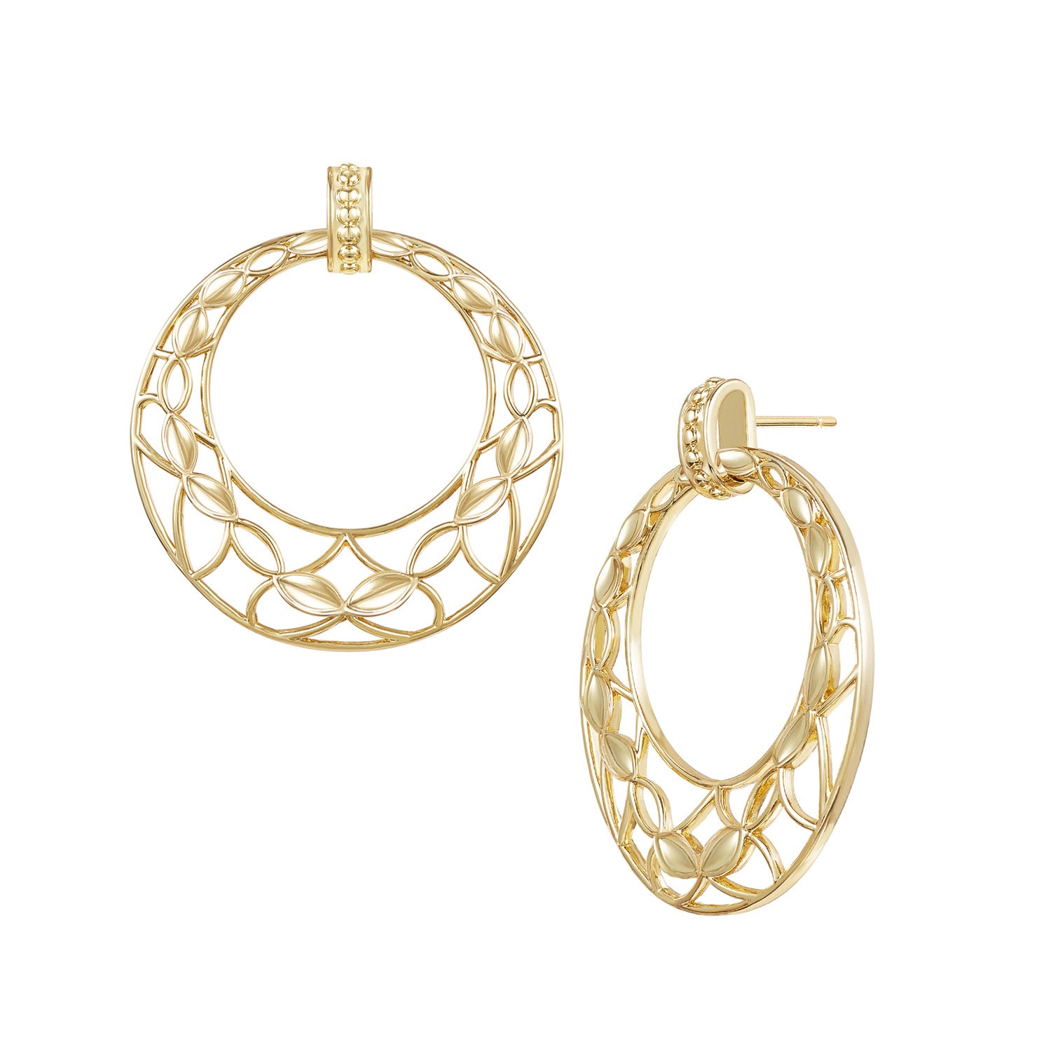 Meet your new statement earrings. Designed in luminous 14K gold-plated brass, these earrings feature Natalie Wood Designs’ signature open-filigree motif, symbolizing strength and grace. The airy pattern catches the light beautifully, creating an effortless balance of boldness and femineity.
